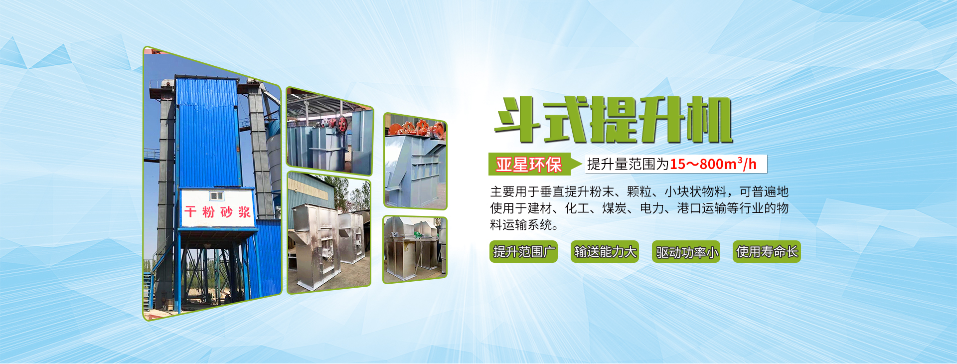 公司主要產品包括:環鏈斗式提升機、板鏈斗式提升機、皮帶斗式提升機、管式螺旋輸送機、U型螺旋輸送機、有軸螺旋輸送機、無軸螺旋輸送機、不銹鋼螺旋輸送機、刮板輸送機、皮帶輸送機、各類提升、輸送設備配件,廣泛應用于礦業、化工、冶金、建材、煤炭、港口、船舶、耐火材料等行業的物料提升、輸送、儲存等環節。